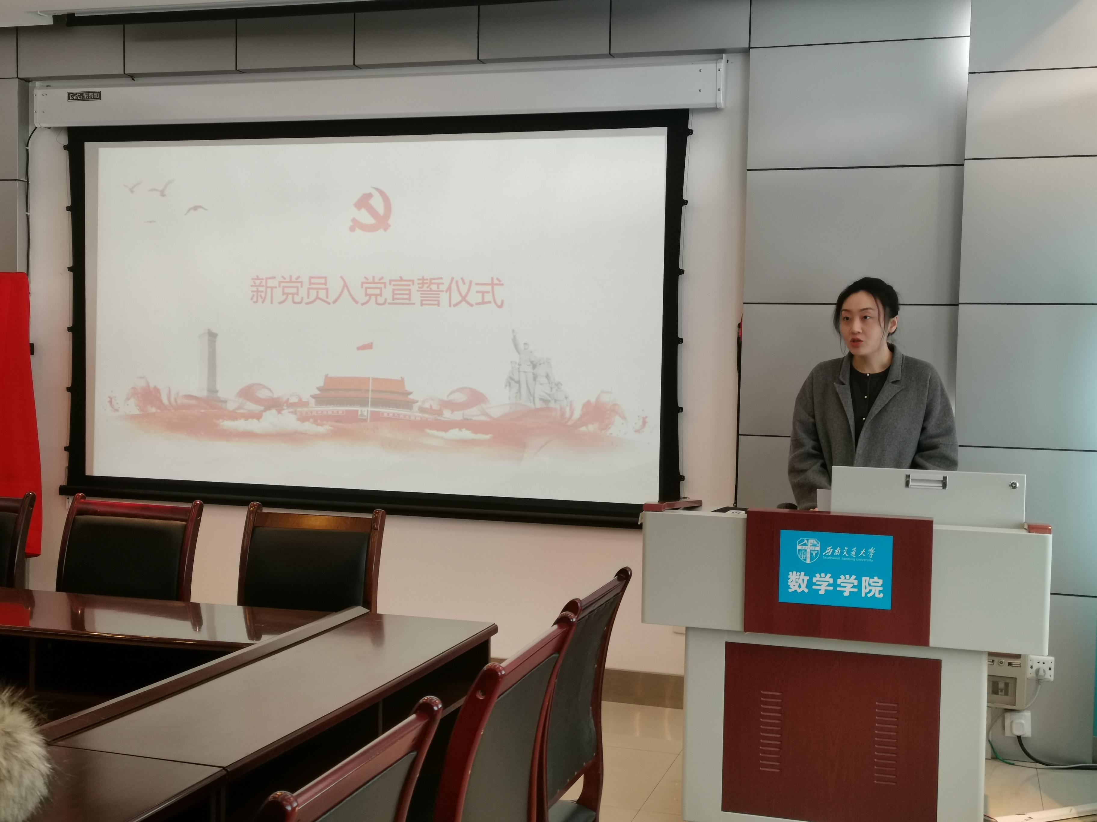 12月17日中午12点整,太阳集团tcy8722新党员入党宣誓仪式在x2511召开。本次仪式由公司专职组织员卢怡帆老师主持,数学公司党委副书记杨育鸿老师出席、太阳集团tcy8722全体新党员参加本次仪式。