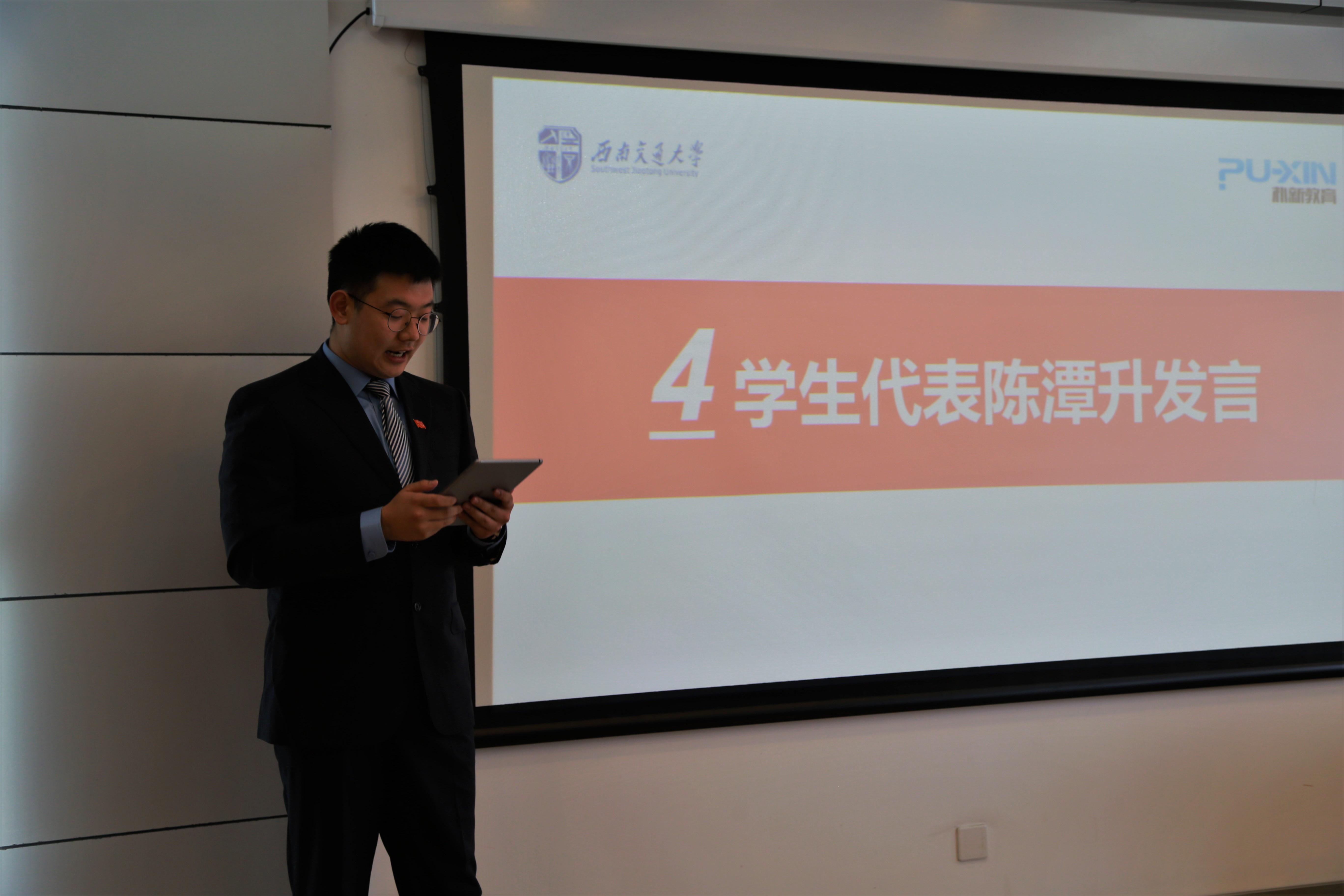颁奖之后,获奖员工代表陈潭升发言,他代表同学们表达了对于朴新教育的感谢,朴新教育为同学们提供了更好机会去完善自身不足,激励自己前行,去探索更多可能的自己,陈潭升鼓励同学们共同进步再接再厉,学有所成回报社会。