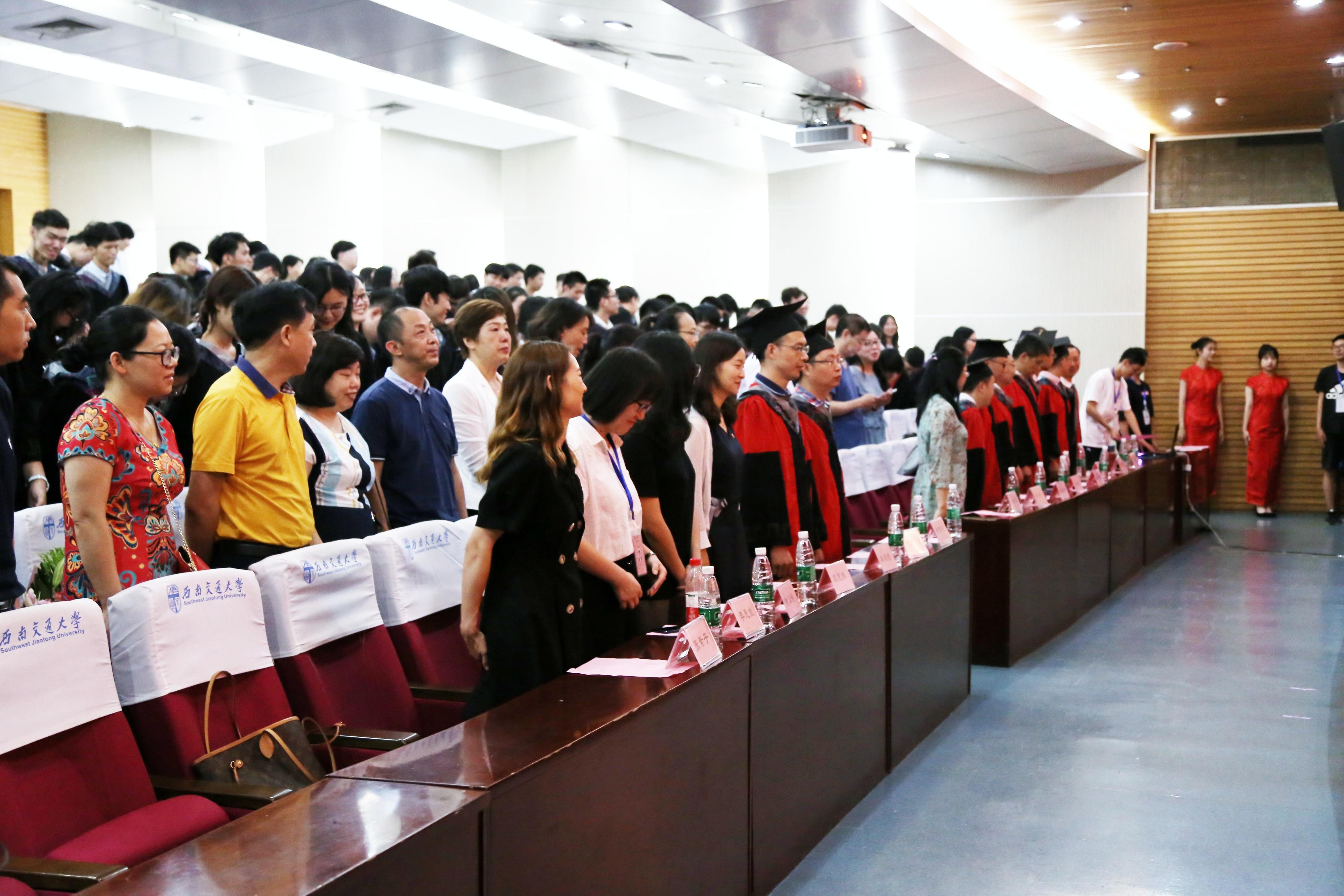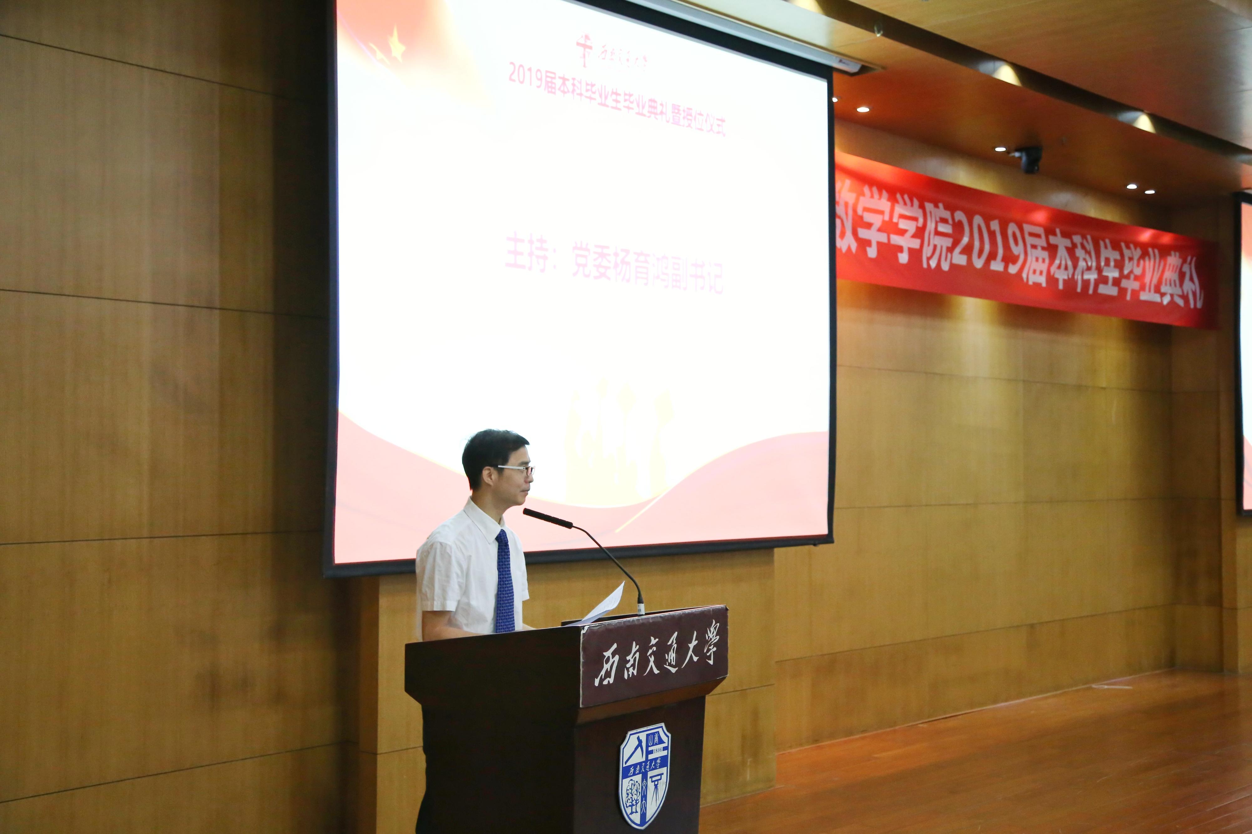 离别满怀,又到六月毕业季。为庆贺2019届太阳集团tcy8722本科生顺利毕业,太阳集团tcy8722于6月22日上午十点半在犀浦校区图书馆一楼报告厅举行2019届本科生毕业典礼暨授位仪式。数学公司党委书记徐革,常务副经理杨晗,副经理潘小东、王璐、李志辉,党委副书记杨育鸿,数学系副系主任黎定仕,统计系主任唐家银,信息与技术科学系主任赵海良,公共数学教学研究部樊明书,毕业班班导师肖建波,团委书记邓思然,辅导员李思佳、张素子、钟义婷,还有2019届太阳集团tcy8722全体毕业生和部分员工家长参加仪式。典礼由数学公司党委副书记杨育鸿主持。