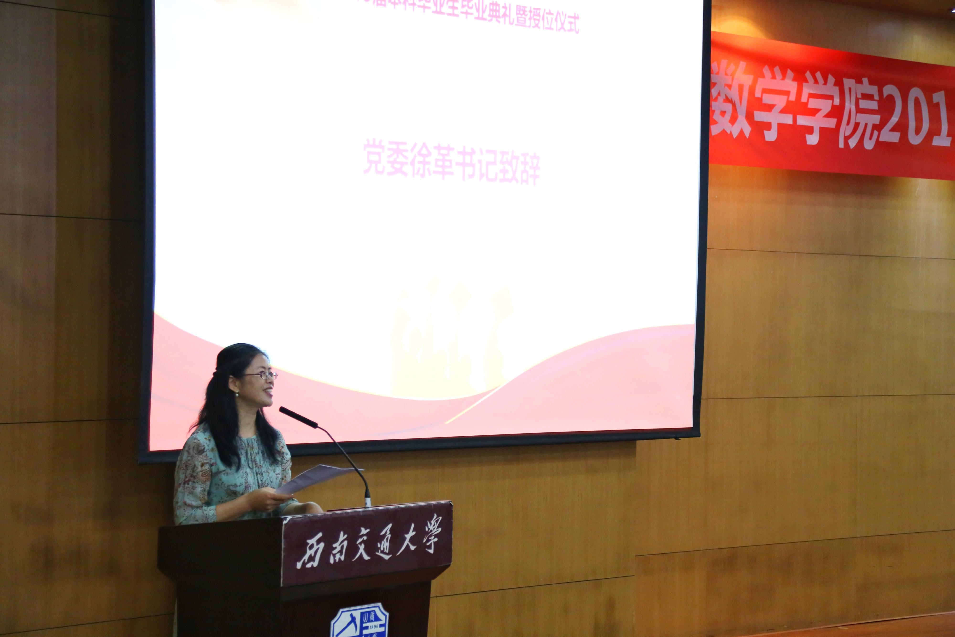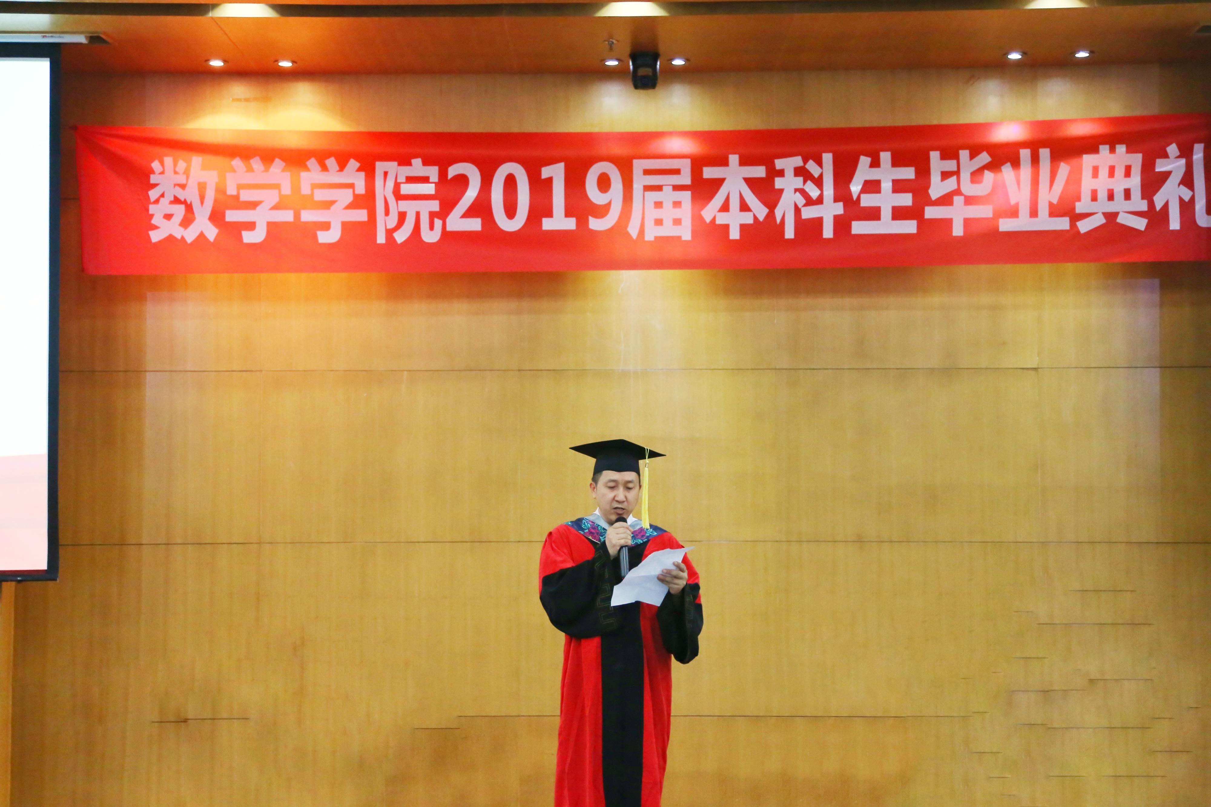再奏唱完国歌后,常务副经理杨晗代表公司宣读了授位决定,并祝福各位同学毕业快乐。授位决定书宣读完毕后,数学公司党委书记徐革致辞。首先徐革书记向2019届本科毕业生及员工家长表示热烈的祝贺,祝贺数院学子顺利完成大学学业,圆满毕业。徐书记对19届本科毕业生提出几点希望:第一,要正确认识自己。唯有通透地认知感受哲学的三大命题,才能走好自己的人生路。第二,要有终身学习的能力。人生漫漫,大学只是时间轴上的一段,数院学子要有自信,有动力,有毅力去不断充实自己,提高综合素质。第三,要树立责任与担当的精神。要谨记时代使命,在社会上发光发热,做对国家对人民有建树的栋梁之材。最后徐革书记重温交大校训,殷切希望数院学子浸润交大品质和交大灵魂,继承竢实扬华,自强不息交大精神,在忙碌的生活中不迷茫,千帆历尽前程似锦。