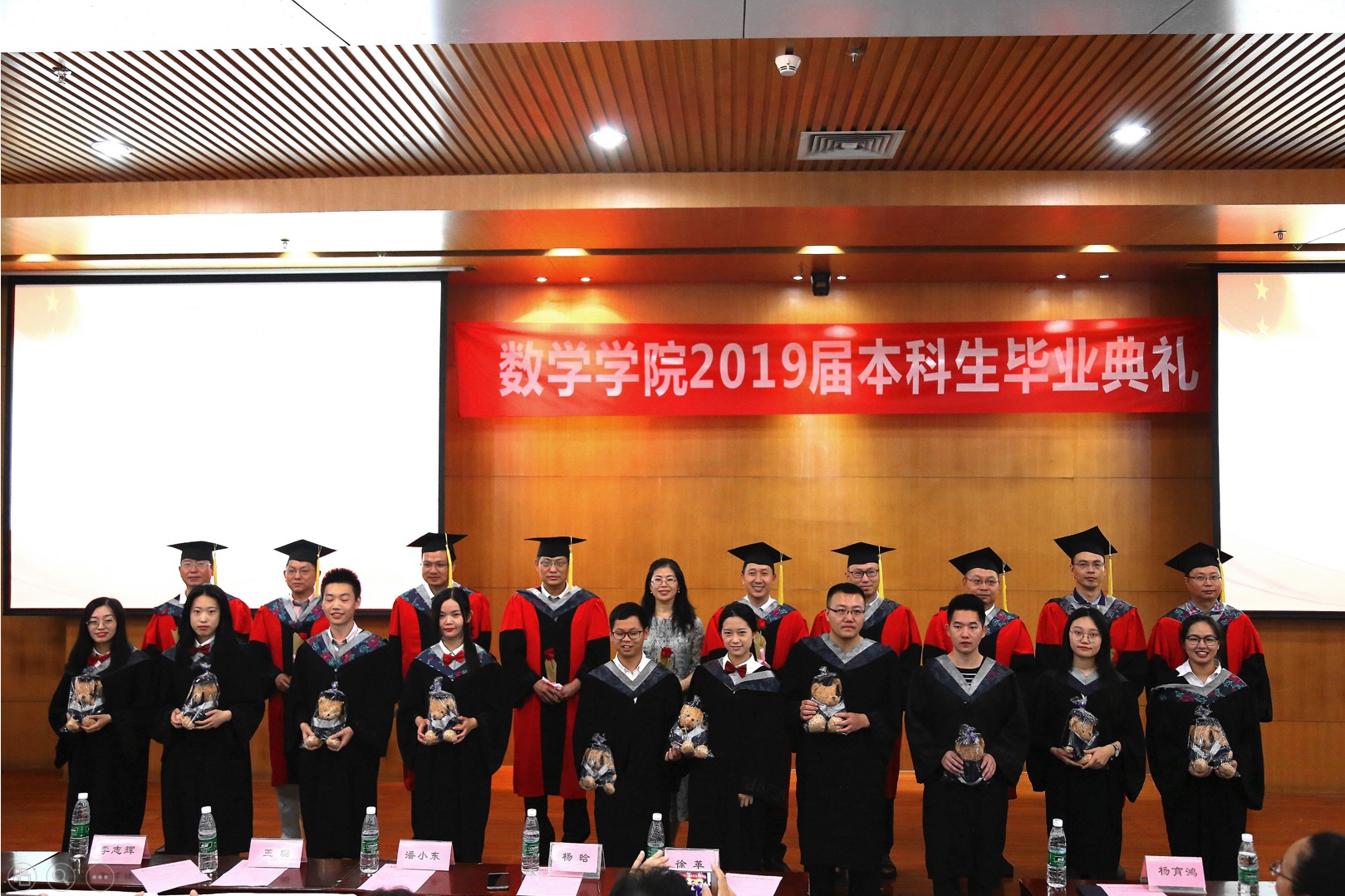 发言结束之后,进行员工与公司互赠礼物环节,员工代表向公司老师们赠送了精美的鲜花,感谢公司老师们的辛勤培育,也祝愿各位老师桃李满天下,祝愿公司和公司越来越好,同学们也将不忘公司教诲,做有理想有担当的数院人。接着,公司老师们为优秀毕业生赠送了辅导员老师亲手缝制的毕业卡通玩偶,一针一线都寓意着公司对同学们的美好祝福。同时,公司还为所有毕业生准备了公司定制笔记本和钢笔作为毕业礼物。