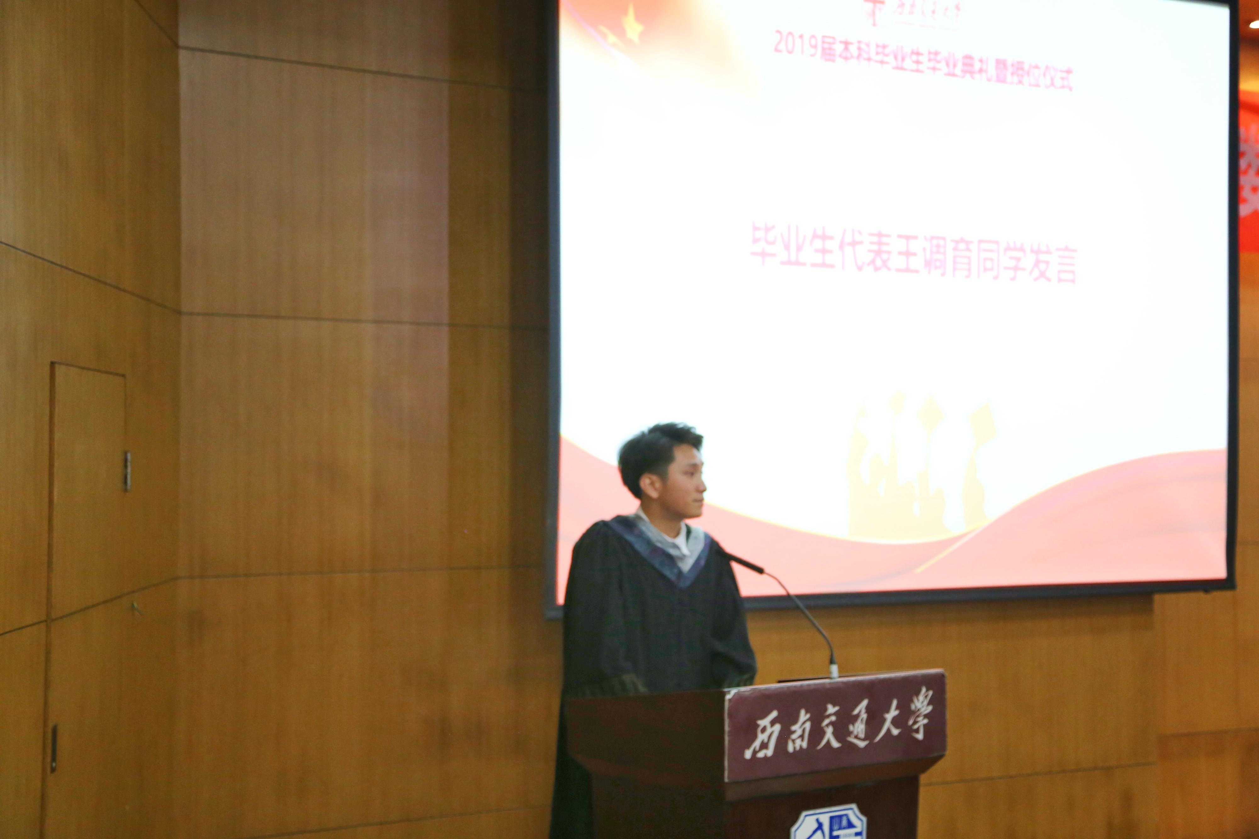 随后,毕业生代表王调育发言,他代表本科毕业生向公司公司及全体老师致以最崇高的谢意,他在发言中说到,光阴似箭,大一参加的各项活动恍如昨日。毕业是四年美好时光的结束,更是另一段新征程的开始。毕业生们将继续秉承竢实扬华自强不息的优秀品质,乘风破浪,勇往直前。
