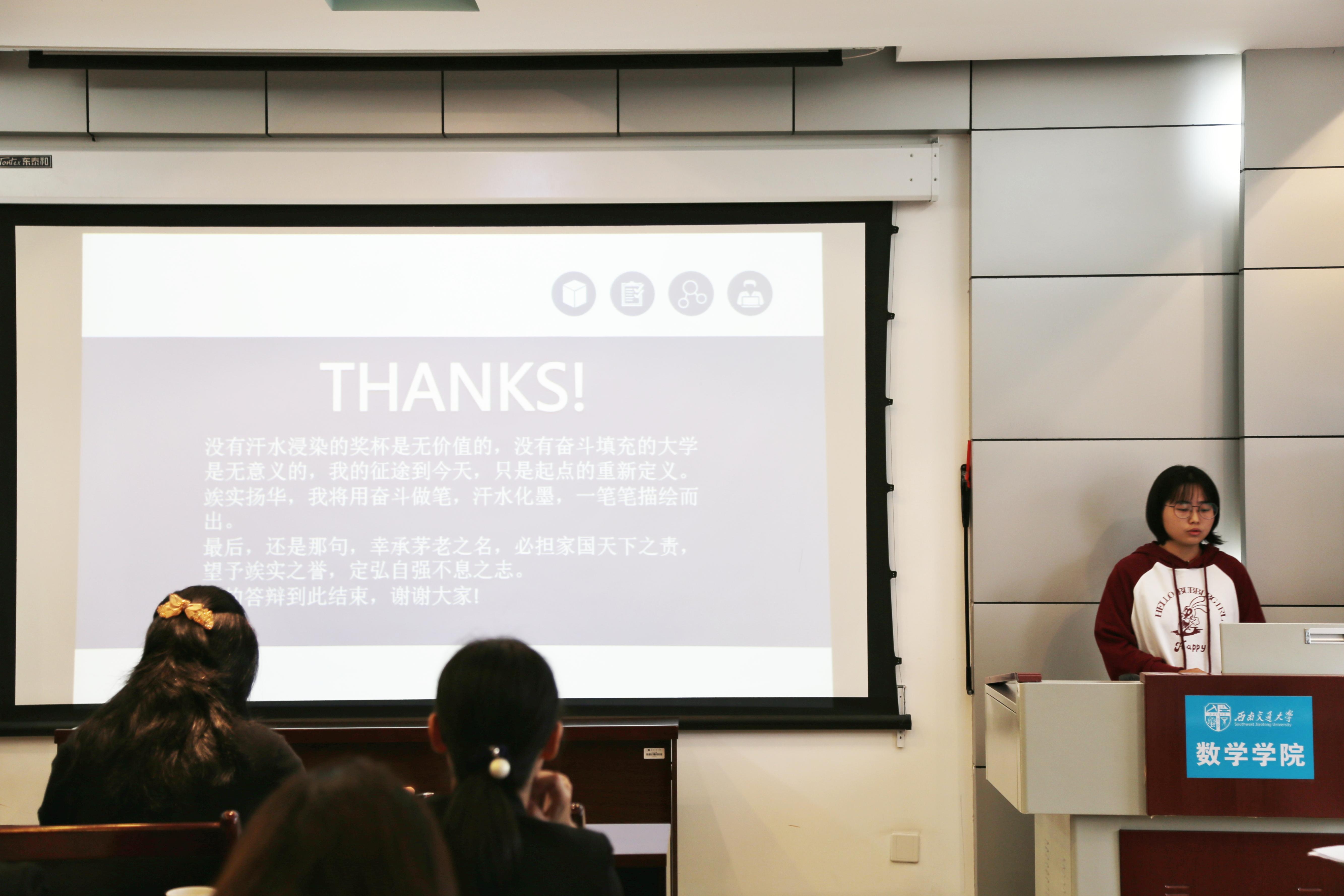 紧接着进行的是省级优秀本科毕业生的答辩。由罗江毅,周小兰两位同学上台答辩。两位同学均以优异成绩获得保研资格,除学业成绩,他们还在科研竞赛、员工工作、社会实践等多方面全方位地展现了自我,充分体现了交大数学人“竢实扬华,自强不息”的精神,为各年级同学做出优秀榜样!