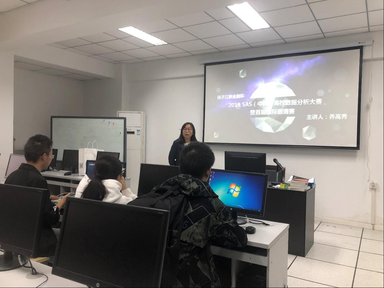 其次,乔高秀老师讲述了SAS比赛的赛制和时间以及大赛奖励。本次比赛分为三个阶段:初赛,复赛和决赛。其中今年初赛时间为10月17日-20日,27日-28日在此阶段每天的9:00-17:00。随后介绍了大赛分为冠军,亚军,季军及4-10名四个名次以及各个名次相应的奖励。