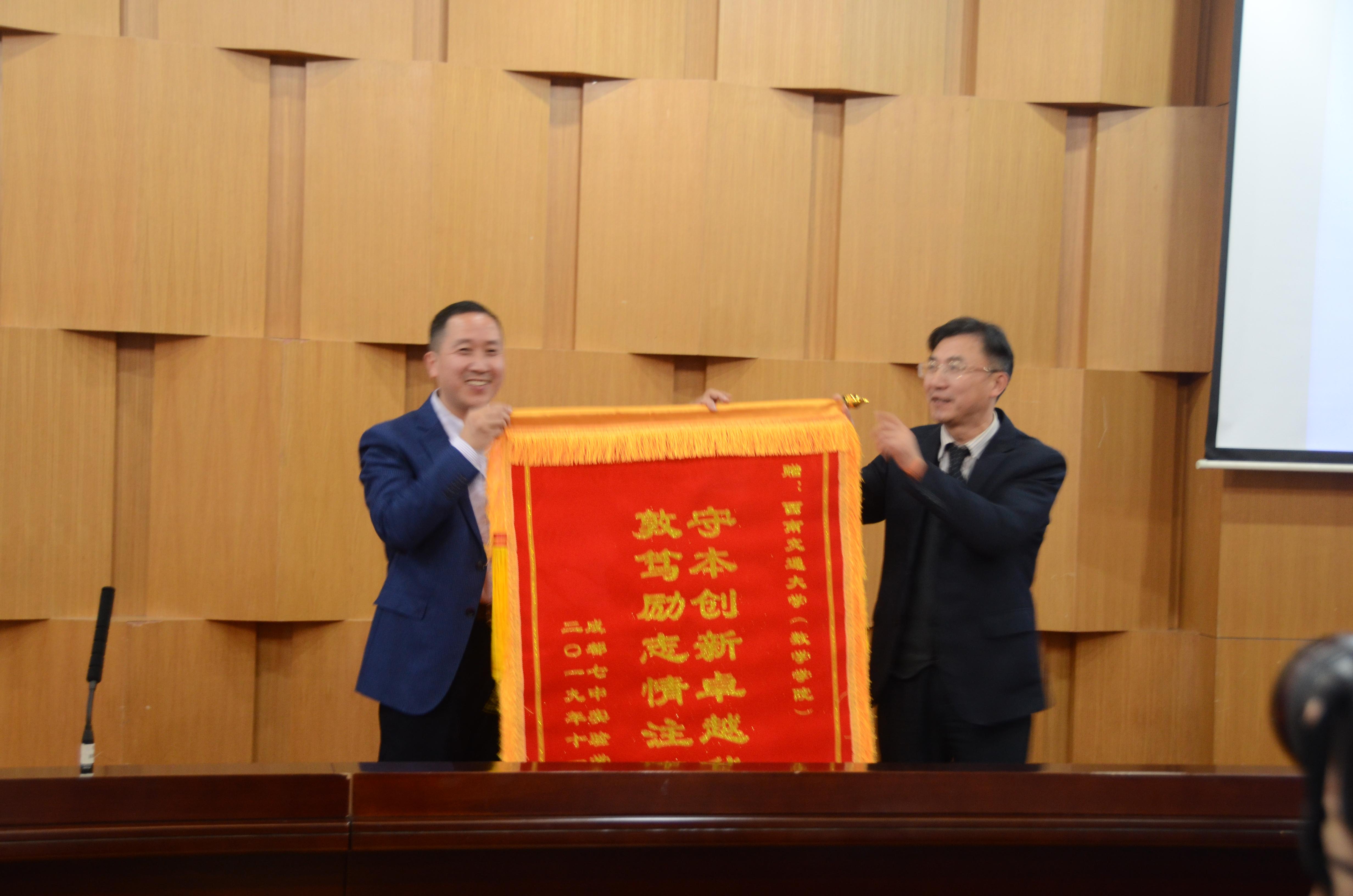 讲座结束后,成都七中实验公司高中部德育处张和平主任代表成都七中赠与太阳集团tcy8722锦旗一面。“守本创新卓越华夏,敦笃励志情注七实。”最后全体来访师生于图书馆前合影留念。至此,此次参观交流活动在老师同学们的欢笑声中圆满结束。