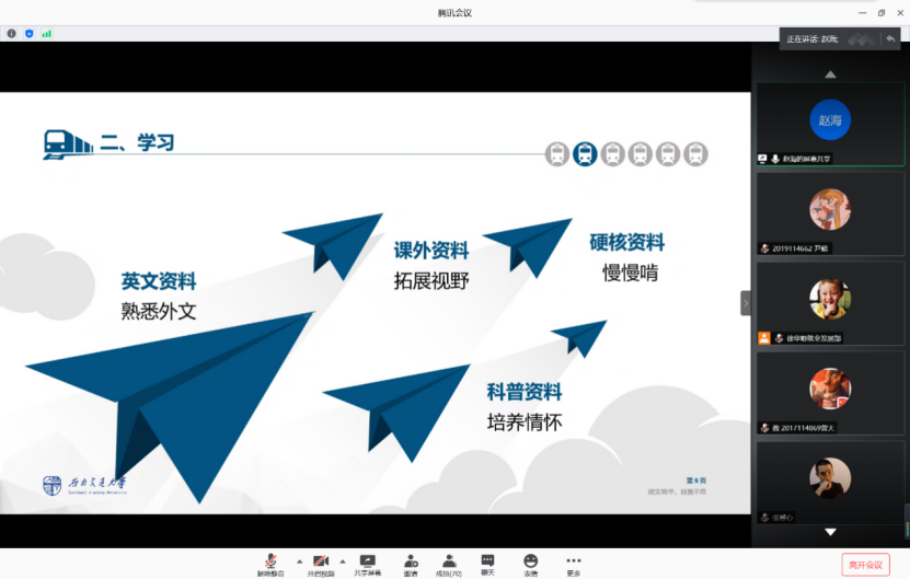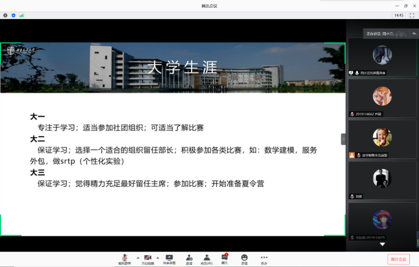 接下来,2016级赵海同学从自己的老员工活开始讲述,分享了自己在学习、生活、竞赛、免研准备等多个方面的经验,着重介绍了在学习方面的经验与方法。