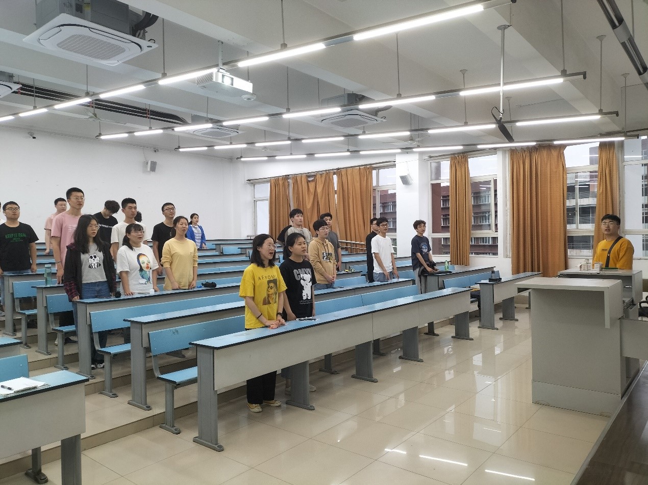 团日活动第二项议程,全体起立,由团支书领誓,数学2018级01班全体团员重温入团誓词。