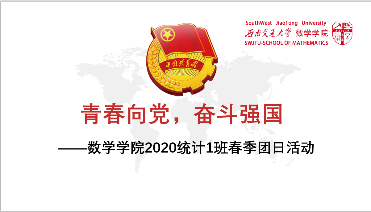 2021年是中国共产党成立100周年,党中央决定在全党开展党史学习教育,为了迎接中国共产党成立100周年,深入学习习近平总书记在党史学习教育动员大会上的重要讲话精神,深化青年思想政治引领,按照校,党关于党史学习教育工作的各项部署工作要求,2020级统计1班团支部开展“青春向党,奋斗强国”主题团日活动。2021年5月21日早上9:00,2020级统计一班在线上举办了春季开学第一次团日活动。2020统计1班团支部的每一位共青团员都坚持初心,跟着党走。本次团课由团支书张翔主持。