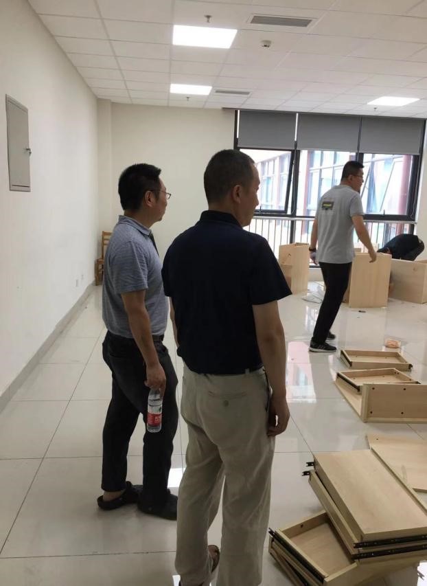 恰逢今天下午公司在制作各房间的功能名称铭牌以及峨眉校区实验室搬迁至犀浦校区,看到工人们忙碌有序的身影,杨经理一行不忘来到专业实验室X30458仔细查看电脑桌椅的安装与摆放,校企合作的“极客科创工作间”X30456也在紧锣密鼓的装修中,强调大家要注意装修期间的用电安全等环节。由于峨眉校区实验室电脑以及配套桌椅此次是分开搬运,电脑桌椅先搬到了犀浦校区专业实验室,搬运终端电脑的车辆还在前往犀浦的路上,杨经理不忘强调要落实人员对接,确保安全。最后,杨经理强调大家要做好此次走访与实验室安全隐患排查的记录与整改,安全责任要落实到位。