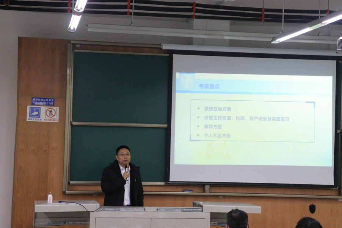 王璐副经理从四个考核方面为标准,指出必须严格规范思想政治方面培养过程,严格进行科研、资产设备及实践学习的指导与审查工作。