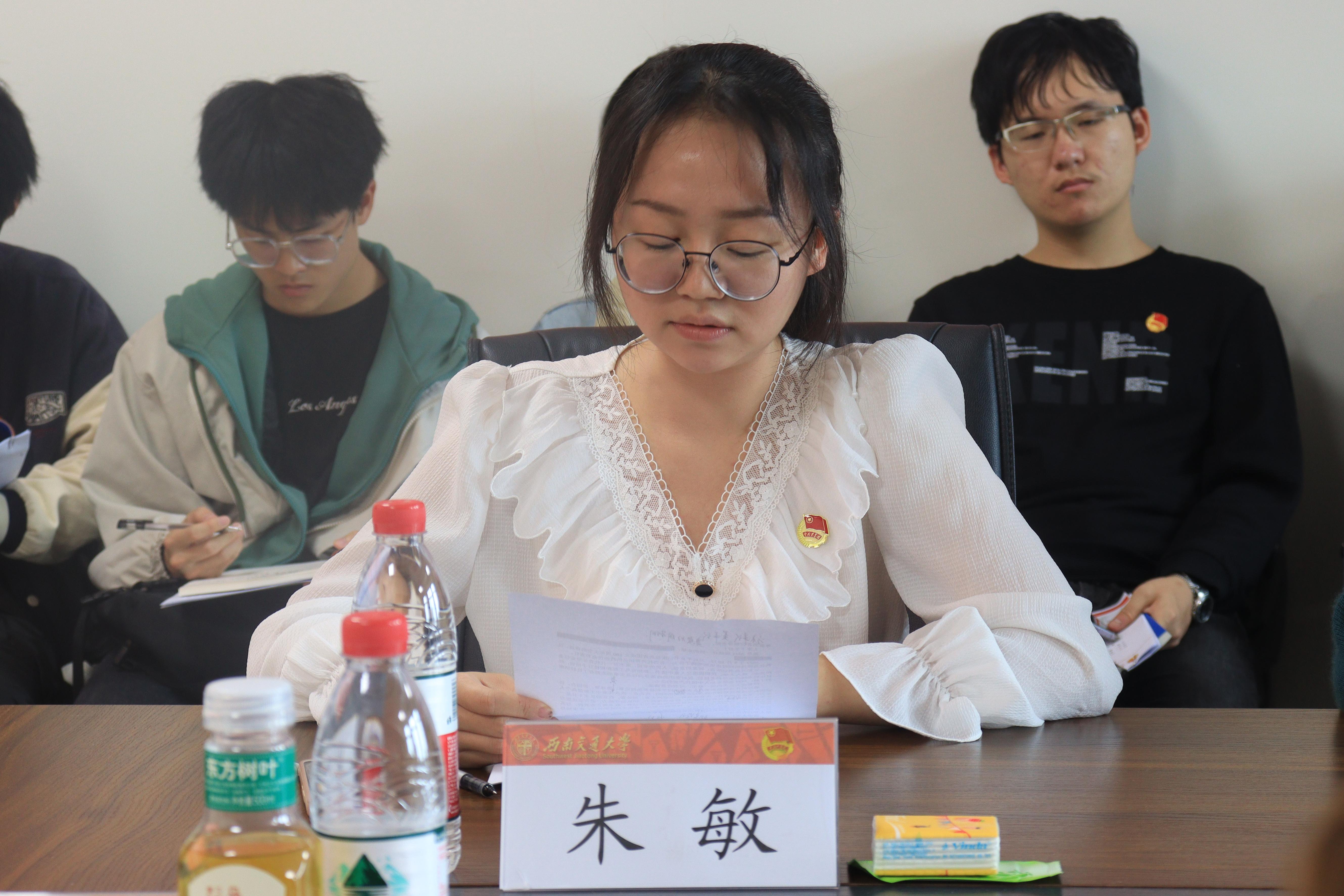 共青团员代表、2021级本科生朱敏分享了她初入大学,在专业学习、学科竞赛、员工工作与志愿服务中不断突破自我,发展自我的历程。