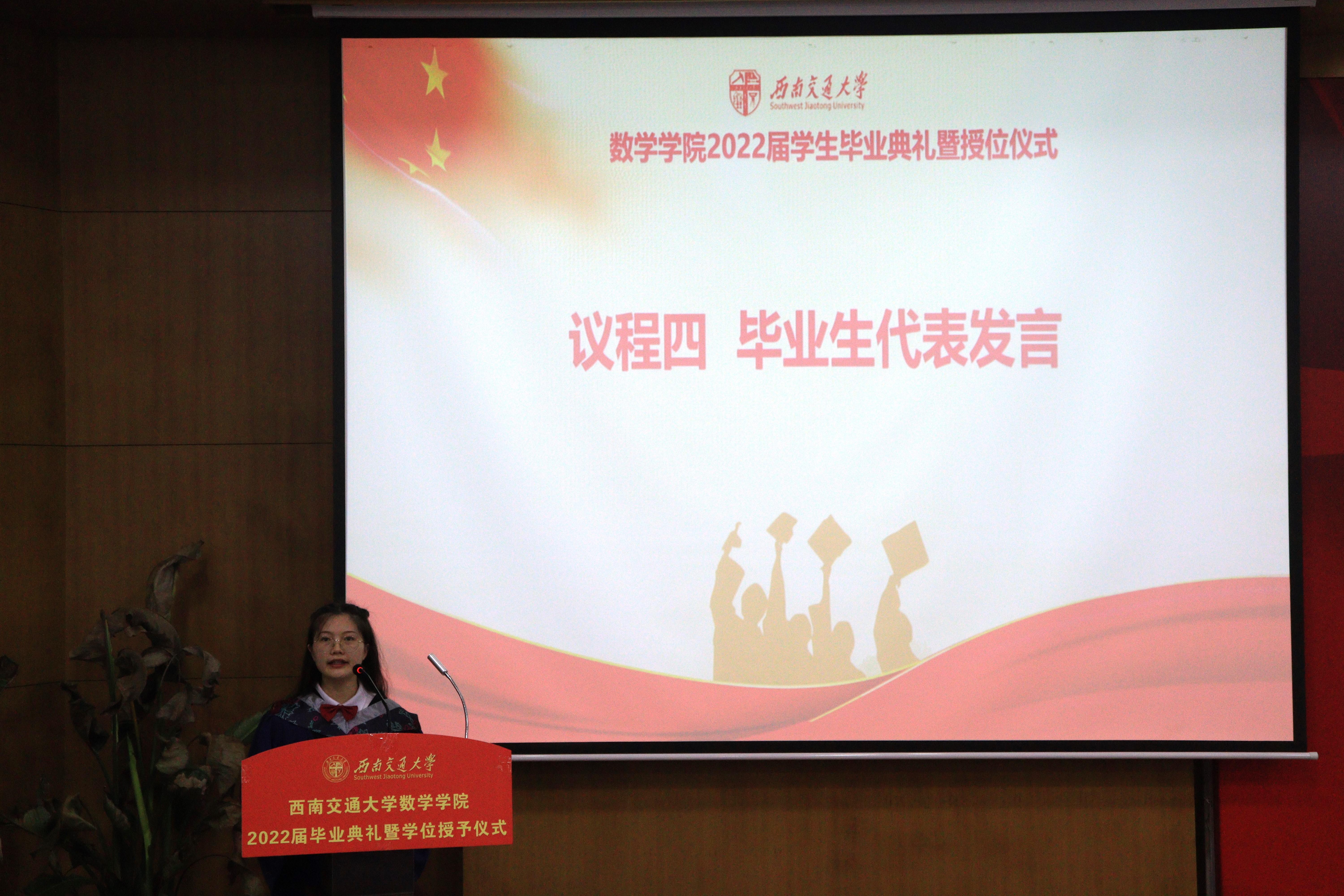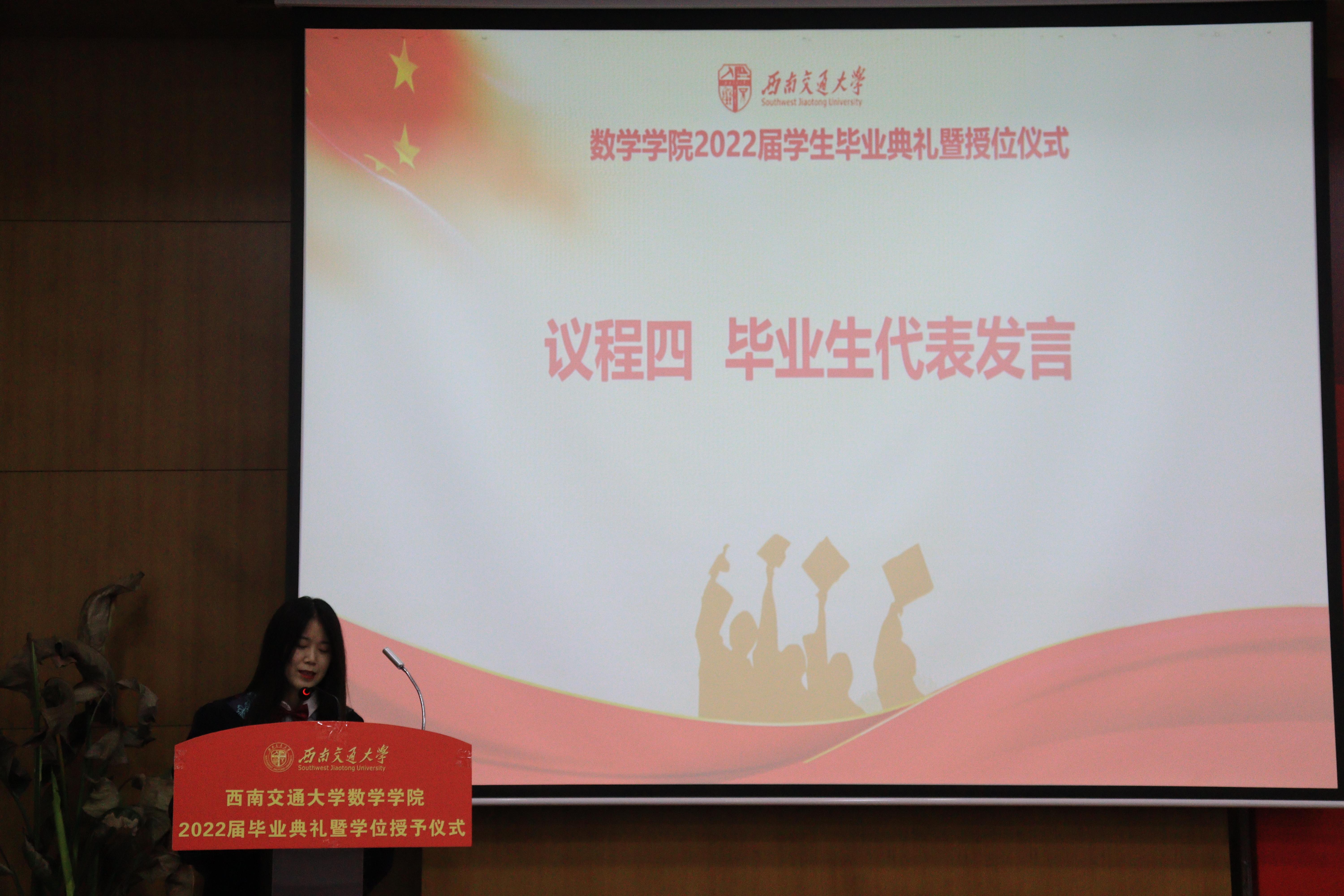首先发言的是2019级研究生毕业生代表杨丽莎。她对辛勤培育我们的老师表达感谢。“从四面八方而来,往五湖四海而去。”三年的时间让数院的烙印镌刻在她身上。杨丽莎回忆了在数院的所学所感,她希望大家在新的人生旅途上爱惜身体心灵,爱身边的人。即使生活不能如所愿,也要永远保持年轻,永远善良。同时,她希望大家怀揣梦想,脚踏实地,主动走出舒适区,努力追逐自己的梦想。最后杨丽莎表达了对母校、公司、老师以及同学们的衷心祝愿。