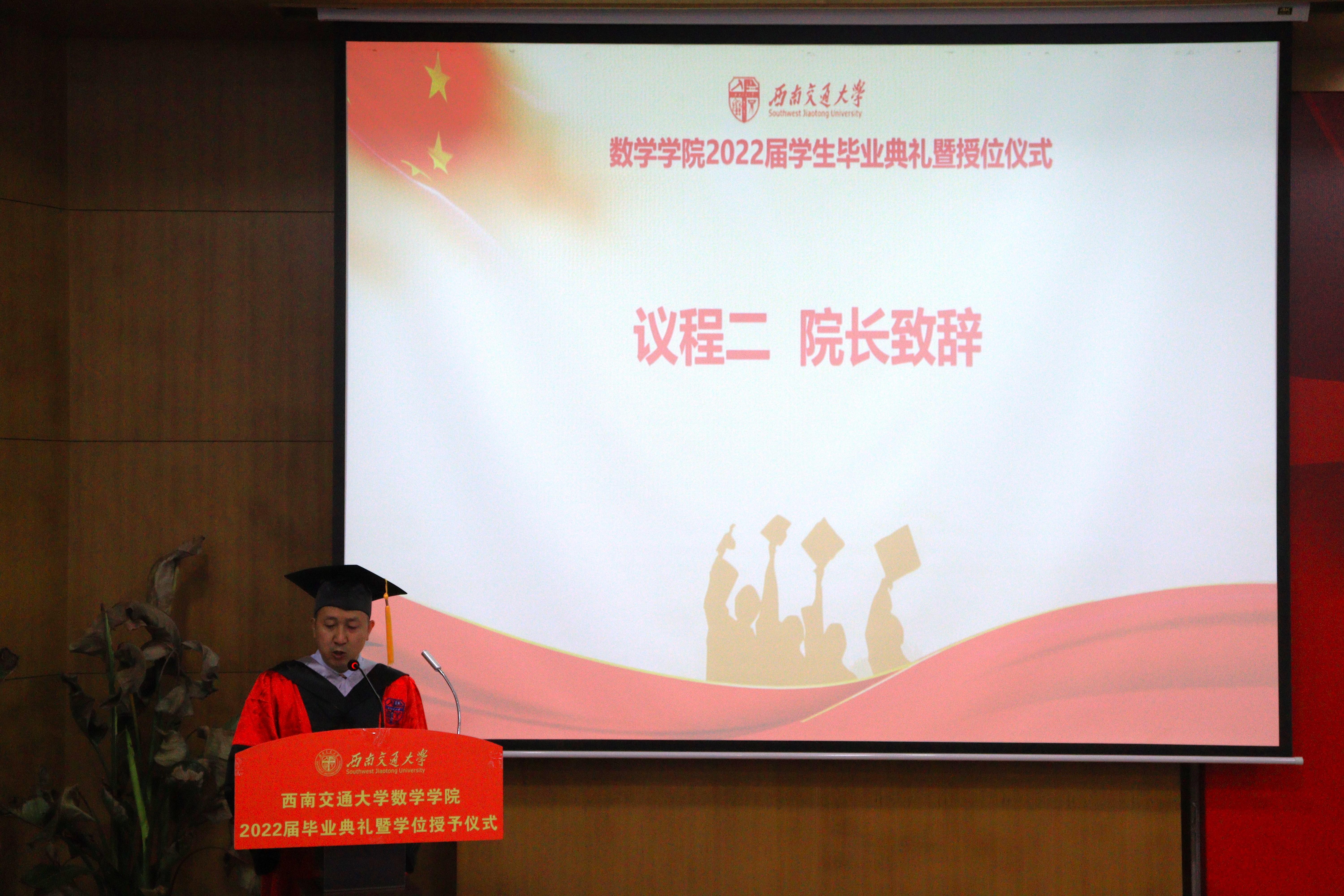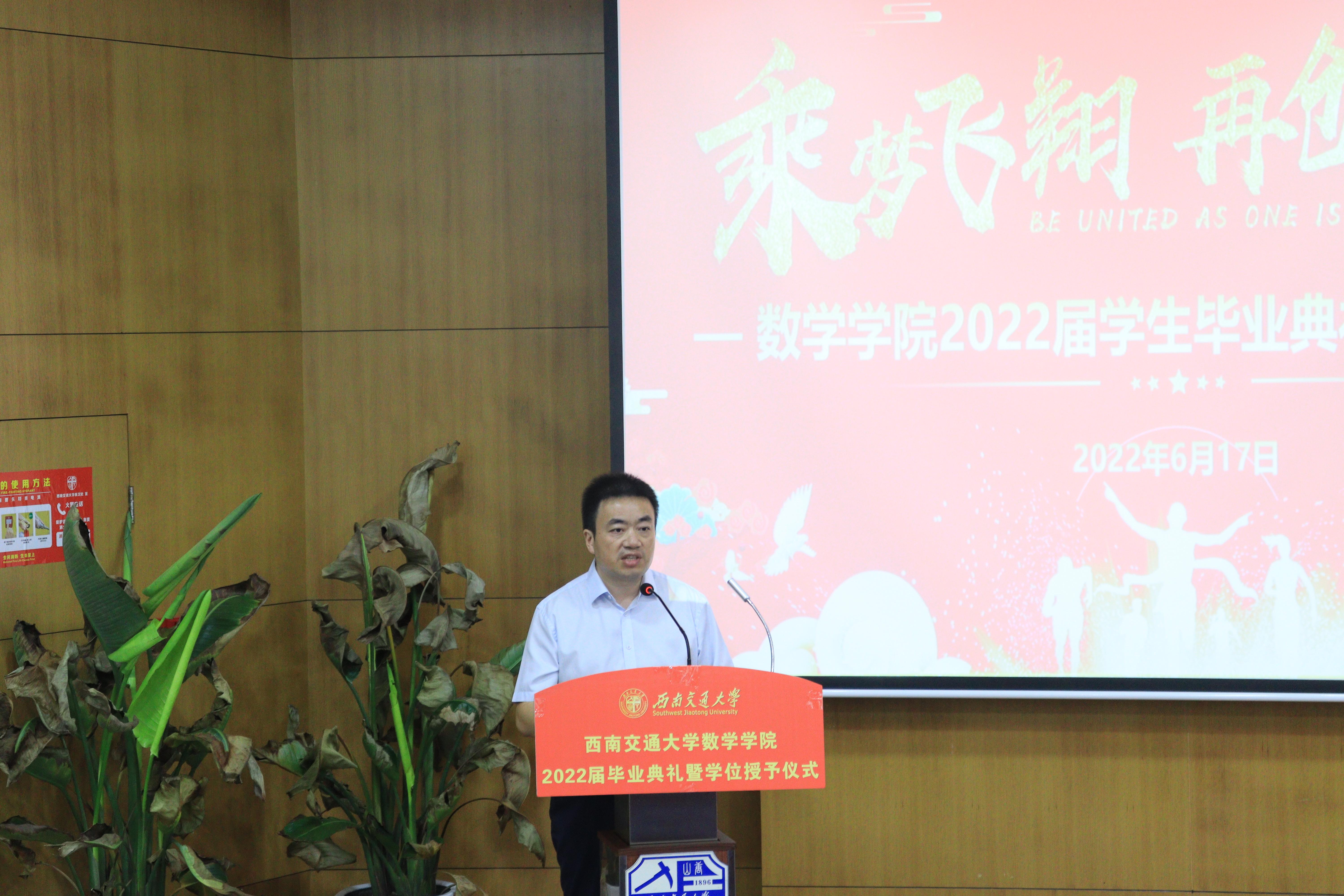 在即将离别之际,杨晗经理对同学们提出殷切叮嘱,希望同学们在新的赛道跑出加速度,书写出更加绚烂多彩的篇章。他提到,火热的青春需要坚定理想信念,厚植家国情怀,新时代青年应该坚定不移跟党走,为党和人民奋斗,不忘初心、牢记使命,为实现国家富强、人民幸福而贡献力量。同时,杨晗经理强调,作为交大数学人,同学们应当仰望星空,脚踏实地;树立鸿鹄之志,为远大梦想而扬帆起航;养成终身学习的好习惯,在学习与实践中增长知识、锻炼品格,以真才实学服务人民。生活难免充满荆棘坎坷,杨晗经理嘱咐同学们无论遇到何种困难,都应秉持“追风赶月莫停留,平芜尽处是春山”的人生态度,并强调母校的老师们永远是同学们坚强的后盾。他还提到,每个中国人都是中国梦的参与者、创造者,希望同学们胸怀伟大梦想,用奋斗成就未来。最后杨晗经理向全体交大数学人宣布太阳集团tcy8722三个本科专业全部成为国家本科一流建设点的好消息并再次表达对2022届毕业生诚挚的祝福。