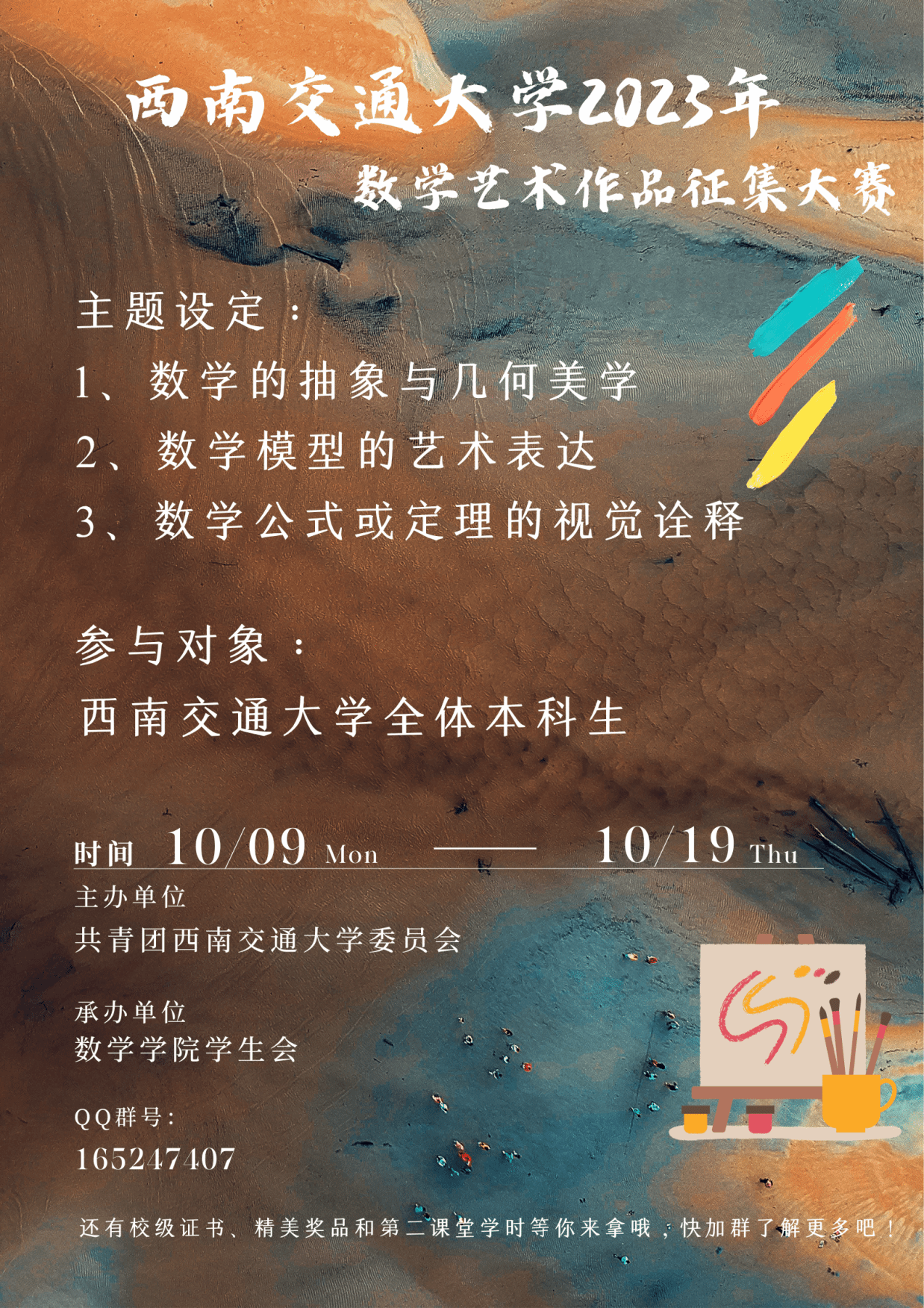 在当今数字化时代,数学已成为科学发展和现代社会不可或缺的基石。为了鼓励更多人了解和热爱数学,同时展现数学之美的艺术魅力,激发参赛者对数学的兴趣和热爱,培养他们的创造力和艺术才能探索数学与艺术的结合,展示数学的美学价值,特举办2023年“数学之美”艺术作品征集大赛。