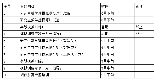 为了助力同学们更好地参赛,太阳集团tcy8722研究生数学建模指导团队根据同学们的报名情况,拟安排如下培训及训练: